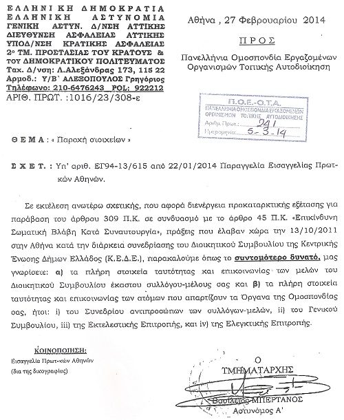 Μέσω της Διεύθυνσης Ασφαλείας Αττικής ζητάει όλα τα στοιχεία ταυτότητας και επικοινωνίας των μελών που συμμετέχουν στα όργανα της Π.Ο.Ε.-Ο.Τ.Α. (Γενικού Συμβουλίου, Εκτελεστικής Επιτροπής, Ελεγκτικής Επιτροπής), αλλά και όλων των συναδέλφων που απαρτίζουν τα Διοικητικά Συμβούλια των Συλλόγων-Μελών της Ομοσπονδίας και των αντιπροσώπων στο Συνέδριο της Ομοσπονδίας. Εκείνο που δεν ζήτησε ακόμη η Ασφάλεια Αττικής είναι τα στοιχεία των 70.000 εργαζομένων που εκπροσωπούνται από την Π.Ο.Ε.-Ο.Τ.Α.!!!