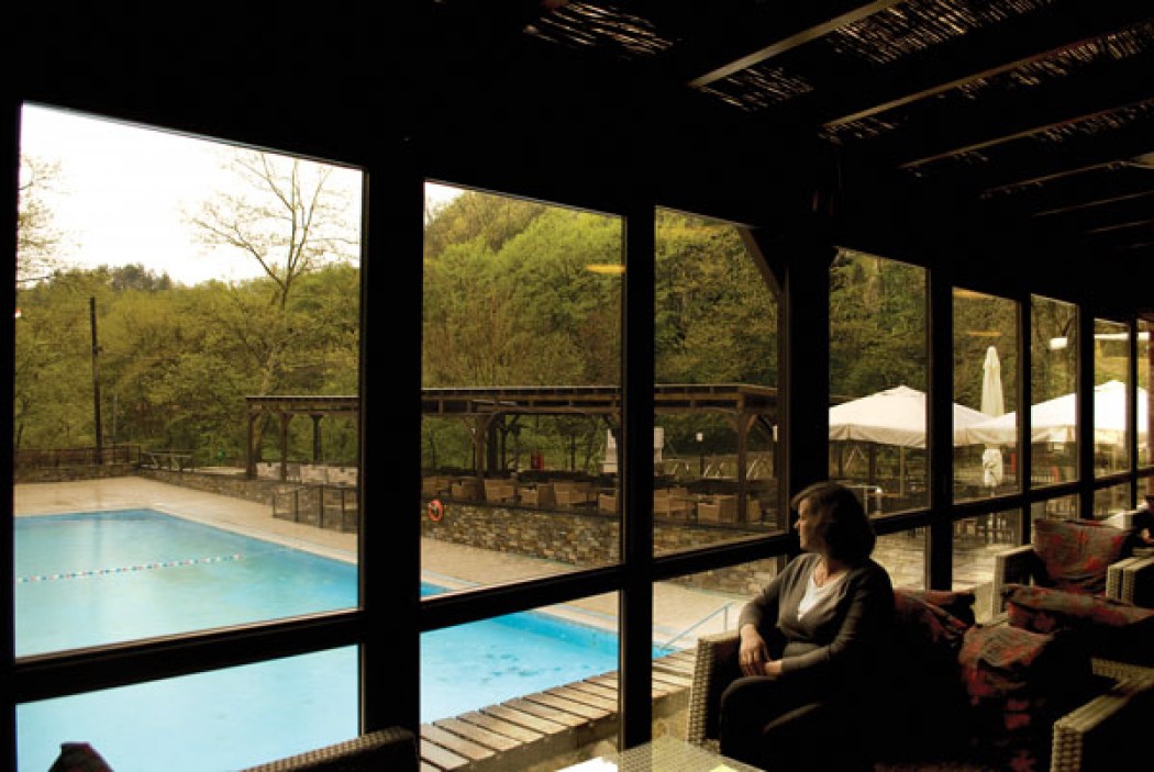 Ö Μαγιό, πετσέτα και παντόφλες για νυχτερινό μπάνιο στο ζεστό εξωτερικό καταρράκτη και παιχνίδι στην εξωτερική πισίνα του βουνού.
