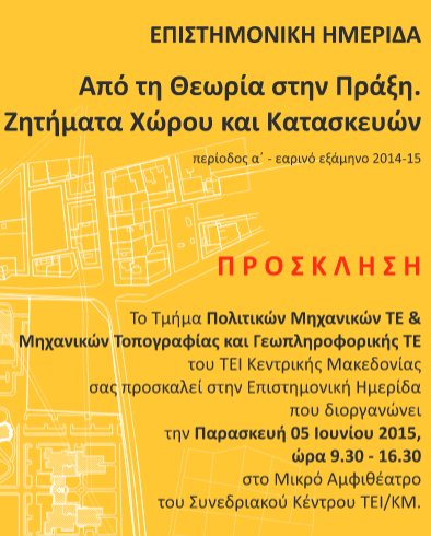 Το Τμήμα Πολιτικών Μηχανικών ΤΕ & Μηχανικών Τοπογραφίας και Γεωπληροφορικής ΤΕ του ΤΕΙ ΚΕΝΤΡΙΚΗΣ ΜΑΚΕΔΟΝΙΑΣ σας προσκαλεί στην ΕΠΙΣΤΗΜΟΝΙΚΗ ΗΜΕΡΙΔΑ με θέμα: Από τη Θεωρία στην Πράξη. Ζητήματα Χώρου και Κατασκευών στις 05.06.2015, ημέρα Παρασκευή και ώρα 9.30 πμ- 16.30 μμ