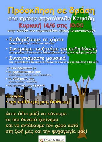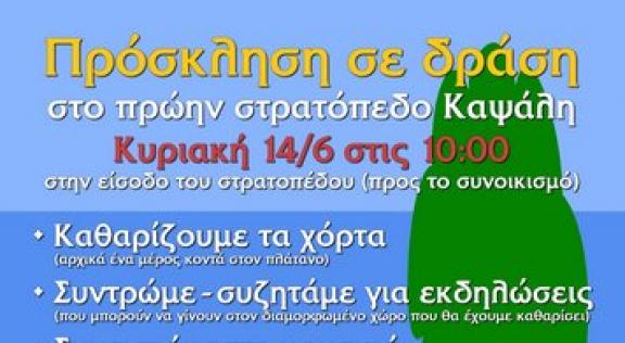 Συνεπώς, σας καλούμε να έρθετε με τα χορτοκοπτικά σας, τα γάντια και τις σακούλες σας, τα εργαλεία σας, όπως τσάπες ή φτυάρια, τις καρέκλες ή τα στρωσίδια σας, τα εδέσματά σας, τα μουσικά σας όργανα και κυρίως την καλύτερή σας διάθεση, ώστε να κάνουμε ένα όσο το δυνατόν καλύτερο ξεκίνημα σε κάτι τέτοιο. Το πρώην στρατόπεδο Καψάλη είναι ένας χώρος που μπορούμε και πρέπει να διεκδικήσουμε για την ένταξή του στην ζωή μας και την ψυχαγωγία μας.