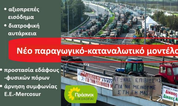 Οι αγρότες είναι τα θύματα των αλόγιστων πολιτικών που οδηγούν σε ερήμωση της υπαίθρου και καταστροφή της παραγωγικής βάσης της χώρας. Χρειάζεται αλλαγή πολιτικών, όχι προσωρινές λύσεις, τονίζουν οι ΠΡΑΣΙΝΟΙ -Οικολογία, δηλώνουν πως κατανοούν την έκρηξη οργής των αγροτών, απορρίπτουν την καταστολή, θεωρούν τη συμφωνία Ε.Ε.-Mercosur αταστροφική για το περιβάλλον και τον αγροτικό κόσμο και καταθέτουν συγκεκριμένες προτάσεις για ένα βιώσιμο και δίκαιο μέλλον. Στόχος τους είναι ένα παραγωγικό -καταναλωτικό μοντέλο, ανθεκτικό απέναντι στην κλιματική κρίση, που θα εξασφαλίζει αξιοπρεπές εισόδημα στους παραγωγούς και διατροφική αυτάρκεια στη χώρα, με προστασία του εδάφους και των φυσικών πόρων.Η δικαιολογημένη απόγνωση του αγροτικού κόσμου οφείλεται στις συνεχώς επιδεινούμενες συνθήκες, οικονομικά και περιβαλλοντικά, εξαιτίας των πολιτικών που προωθούνται τόσο σε εθνικό όσο και σε ευρωπαϊκό επίπεδο. Η εκτόξευση στα ύψη του κόστους παραγωγής (με κεντρικό ζήτημα τις τιμές ενέργειας αλλά και λόγω της εξάντλησης των εδαφών και των φυσικών πόρων – πρωτίστως του νερού), η έλλειψη στήριξης για τους μικρούς και μεσαίους παραγωγούς, οι επιπτώσεις της κλιματικής αλλαγής και οι αθέμιτες εμπορικές συμφωνίες, παράλληλα με την, χωρίς σχεδιασμό, επιδίωξη ενός βιομηχανικού μοντέλου γεωργίας που καταστρέφει τη φύση, οδηγούν σε αδιέξοδο τον πρωτογενή τομέα. Οι αγρότες οφείλουν, από τη μεριά τους, να καταλάβουν ότι δεν μπορούν να στηρίζονται σε κυβερνητικές πολιτικές, οι οποίες εδώ και δεκαετίες αρνούνται να δουν τα προβλήματα της υπαίθρου και τους αντιμετωπίζουν ως μια οποιαδήποτε επαγγελματική ομάδα. Η εμπορική συμφωνία Ε.Ε.-Mercosur, που έγινε πριν μερικούς μήνες και, εκτός των άλλων καταστροφικών για το περιβάλλον επιπτώσεων, εκθέτει τον αγροτικό κόσμο στον αθέμιτο ανταγωνισμό και την πτώση των τιμών, αποτελεί ένα πρόσφατο παράδειγμα αυτών των πολιτικών. Η κρίση της γεωργίας είναι και περιβαλλοντική κρίσηΤο σημερινό αγροτικό μοντέλο δεν είναι βιώσιμο καθώς στηρίζεται σε περιβαλλοντικά και οικονομικά εξοντωτική κατανάλωση ενέργειας, κατασπατάληση νερού και χημικές εισροές. Παράλληλα, εστιάζει σε μονοκαλλιέργειες που συχνά στηρίζονται αποκλειστικά σε ενισχύσεις και δεν συνδέονται με αληθινές ανάγκες της χώρας. Αποτέλεσμα είναι: