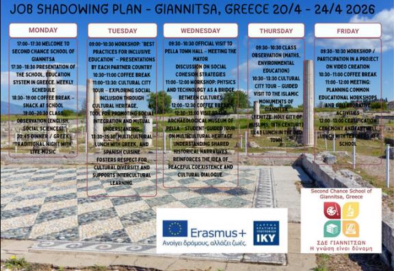 Στο πλαίσιο προγράμματος κινητικότητας Job Shadowing Erasmus+, το Σχολείο Δεύτερης Ευκαιρίας Γιαννιτσών είχε τη χαρά να υποδεχθεί εκπροσώπους του IPEP Córdoba - Instituto Provincial de Educación Permanente από την Cordoba της Ισπανίας. Το IPEP στην Κόρδοβα είναι ένα δημόσιο κέντρο εκπαίδευσης ενηλίκων. Προσφέρει ESO (Υποχρεωτική Δευτεροβάθμια Εκπαίδευση), Bachillerato (Ανώτερη Δευτεροβάθμια Εκπαίδευση), εξετάσεις εισαγωγής στο πανεπιστήμιο, μαθήματα πρόσβασης και εξετάσεις εισαγωγής για Κύκλους Ανώτερης Επαγγελματικής Κατάρτισης, εξετάσεις εισαγωγής στο πανεπιστήμιο (PAU), δωρεάν εξετάσεις Bachillerato κ.λπ., σε μορφή φυσικής, μικτής και εξ αποστάσεως εκπαίδευσης.