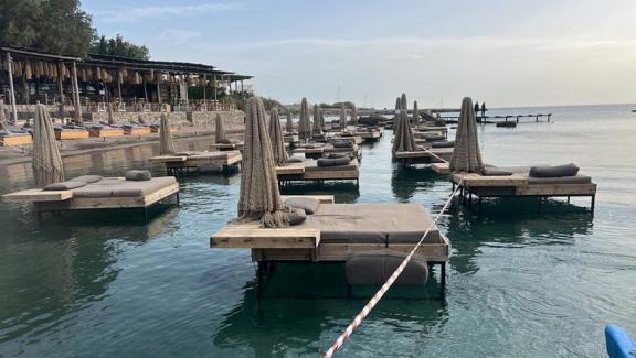 Πρόκειται για το ίδιο beach bar που πέρυσι είχε και πάλι τοποθετήσει πλωτές ξαπλώστρες και οι σερβιτόροι σχεδόν… κολυμπούσαν για να εξυπηρετήσουν τους πελάτες.
