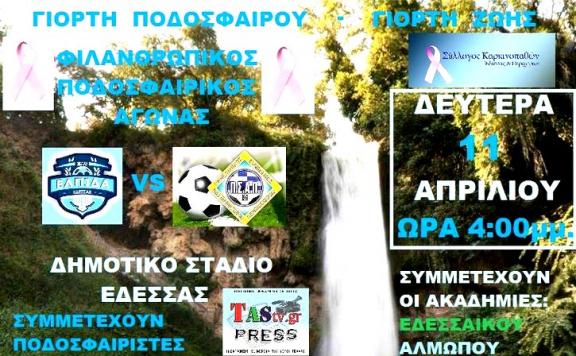 Την Δυετέρα 11 Απριλίου 2016 στις 4 το απόγευμα θα πραγματοποιηθεί η μεγάλη Γιορτή Ποδοσαφαίρου που διοργανώνει ο Αθλητικός Ποδοσφαιρικός Σύλλογος ΕΛΠΔΑ 'Έδεσσας με αγώνα φιλανθρωπικού χαρακτήρα με την ΕΘΝΙΚΗ ΕΛΛΑΔΟΣ όπου θα συμμέχουν 'Ελληνες Διεθνείς ποδοσφαιριστές της Εθνικής Ελλάδος και του ΕURO 2004.