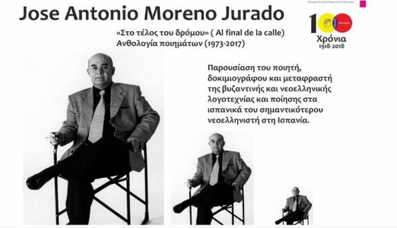 Στο πλαίσιο των εκδηλώσεων για τα 100 χρόνια από την ίδρυση του Φιλοπροόδου Συλλόγου Έδεσσας «Μέγας Αλέξανδρος» και σε συνεργασία με τη Δημοτική Κοινωφελή Επιχείρηση Δήμου Έδεσσας θα παρουσιασθεί το πρόσφατα εκδοθέν στην Ελλάδα βιβλίο του Ισπανού ποιητή Jose Antonio Moreno Jurado «Στο τέλος του δρόμου». –« Al final de la calle» . Ανθολογία ποιημάτων (1973-2017), εκδ.Ρώμη, Ιαν.2018, σελ. 178 , (Δίγλωσση Ελληνοϊσπανική Έκδοση).