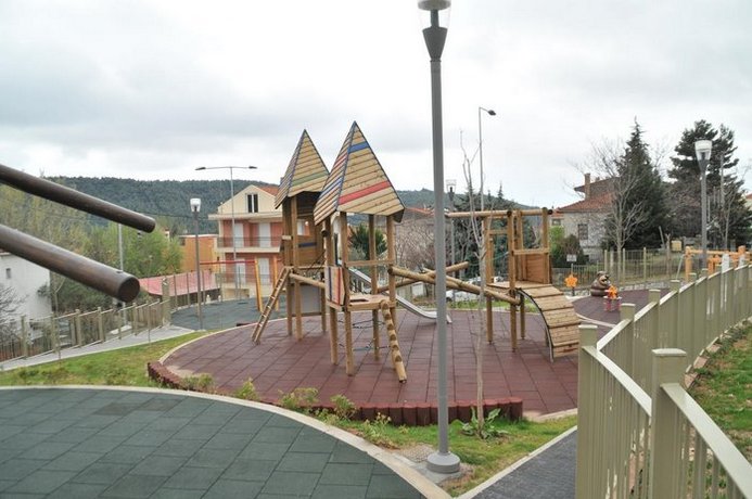 Παρτέρια πρασίνου με τις ανάλογες φυτεύσεις δένδρων για τη σκίαση της παιδικής χαράς ολοκληρώνουν τη σύνθεση και συμπληρώνουν το φυσικό ανάγλυφο.