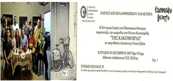 Ο σύλλογός νεφροπαθών ν.Πέλλας "ΟΙ ΑΓΙΟΙ ΑΝΑΡΓΥΡΟΙ" και το Εδεσσαϊκό θέατρο σας προσκαλούν στην θεατρική παράσταση "ΤΗΣ ΚΑΚΟΜΟΙΡΑΣ" που θα πραγματοποιηθεί στην αίθουσα εκδηλώσεων της περιφερειακής ενότητας Πέλλας στην Έδεσσα την Κυριακή 29 Οκτωβρίου και ώρα 9.15 μ.μ.