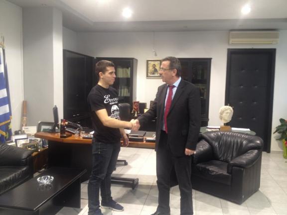Ο Αντιπεριφερειάρχης Πέλλας κ. Θεόδωρος Θεοδωρίδης υποδέχθηκε στο γραφείο του και συνεχάρη τον αθλητή από την Πέλλα Βαλεντίνο Κυριακίδη ο οποίος διακρίθηκε στο τριήμερο πανελλαδικό πρωτάθλημα της Πανελλήνιας Ομοσπονδίας Κικ Μπόξινγκ που πραγματοποιήθηκε το τριήμερο 12-14 Δεκεμβρίου 2014 στο Ολυμπιακό Στάδιο των Νέων Λιοσίων. Ο Βαλεντίνος Κυριακίδης είναι αθλητής των «Μαχητών» Σκύδρας.