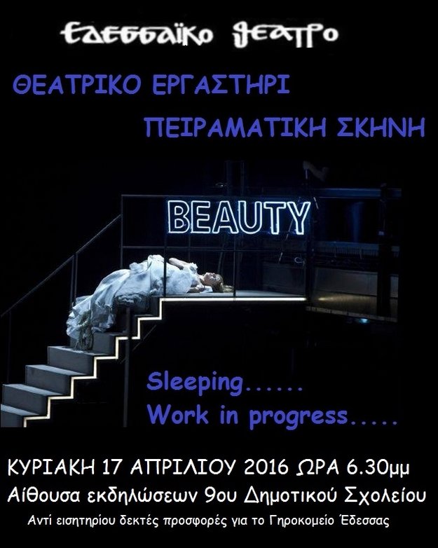 Η Πειραματική ομάδα Εφήβων του Θεατρικού Εργαστηρίου, με συντονίστρια τη Θεατρολόγο του Εδεσσαϊκού Θεάτρου κα Χρύσα Αλεξάκη, θα παρουσιάσει δρώμενο με τίτλο «Sleeping……work in progress» στην αίθουσα εκδηλώσεων του 9ου Δημοτικού σχολείου, την Κυριακή 17 Απριλίου 2016 και ώρα 6.30μμ, στηρίζοντας την φιλανθρωπική δράση του συλλόγου γονέων και κηδεμόνων.