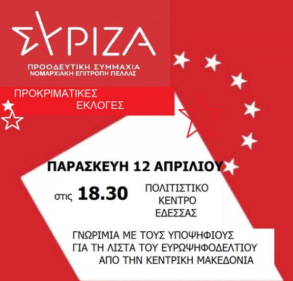 ΣΥΡΙΖΑ ΠΕΛΛΑΣ : ΣΤΗΝ ΕΔΕΣΣΑ ΠΑΡΟΥΣΙΑΣΗ ΤΩΝ ΥΠΟΨΗΦΙΩΝ ΕΥΡΩΒΟΥΛΕΥΤΩΝ