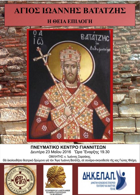 Θα ακολουθήσει θεατρικό δρώμενο για τον Άγιο Ιωάννη Βατάτζη σε σενάριο και σκηνοθεσία της Γιώτας ΦΛΗΡΗ.