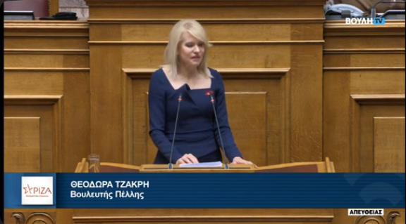 Η Γραμματέας της ΚΟ του ΣΥΡΙΖΑ-ΠΣ και βουλευτής Πέλλας κ. Θεοδώρα Τζάκρη, κατά την τοποθέτησή της στην Ολομέλεια του Κοινοβουλίου επί του σχεδίου νόμου του Υπουργείου Εσωτερικώνγια το «Δάνεια: Διαφάνεια, ανταγωνισμός, προστασία των ευάλωτων - Ενσωμάτωση της Οδηγίας (ΕΕ) 2021/2167, επανεισαγωγή του προγράμματος «ΗΡΑΚΛΗΣ» και άλλες επείγουσες διατάξεις», αρχικά αναφέρθηκε στην τροπολογία για την ασυλία των στελεχών του ΤΑΙΠΕΔ από την αστική τους ευθύνη, λέγοντας ότι την κυβέρνησή της ΝΔ μπορεί να την χαρακτηρίσει κάποιος και ως «κυβέρνηση της ασυλίας». «Η ΝΔ ιστορικά και η κυβέρνηση Μητσοτάκη στην δεύτερη θητεία της και εμείς έχουμε χάσει τον λογαριασμό πόσες για ποιες ασυλίες έχει ψηφίσει μέχρι σήμερα. Από την ασυλία των τραπεζιτών μέχρι την ασυλία των λοιμωξιολόγων της Επιτροπής Λοικοξιωλόγων.Μην δείτε εγκληματική πράξη έχετε μία φυσική ροπή να ψηφίσετε την ασυλία της. Όσες δεν μπορείτε να τις κουκουλώσετεμιντιακά, ακουλουθείτε την «νόμιμη» σε εισαγωγικά οδό της ασυλίας, προκειμένου να μπορούν τα στελέχη σας να κάνουν τις «δουλίτσες» σας και καταλαβαίνετε τι εννοώ «δουλίτσες» εσείς ξέρετε καλά από αυτές, χωρίς να κινδυνεύουν από ποινικές και αστικές ευθύνες. Τι είναι αυτό που ανακαλύψατε πάλι κ. Χατζηδάκη για τα στελέχη στο ΤΑΙΠΕΔ; Τι είναι αυτό το κακό που ετοιμάζονται να κάνουν και ετοιμάζεστε να τους καλύψετε;» είπε η κ. Τζάκρη.