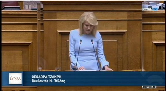 Κατά την παρέμβασή της στην ολομέλεια της Βουλής όπου συζητήθηκε το νομοσχέδιο του Υπουργείου Αγροτικής Ανάπτυξης και Τροφίμων για το «Ενιαίο ρυθμιστικό πλαίσιο για την οργάνωση και λειτουργία του Ελληνικού Γεωργικού Οργανισμού - ΔΗΜΗΤΡΑ, σύσταση και λειτουργία φορέα διαχείρισης Παραδοσιακού Ελαιώνα Άμφισσας και διατάξεις για την ενίσχυση της αγροτικής ανάπτυξης», η Βουλευτής Πέλλας του ΣΥΡΙΖΑ-ΠΣ κ. Θεοδώρα Τζάκρη σημείωσε ότι πρόκειται για ένα νομοσχέδιο που έχει γραφτεί με προχειρότητα και με χωρίς καμία πρόθεση να λύσει τα προβλήματα τα υφιστάμενα προβλήματα του Ελληνικού Γεωργικού Οργανισμού – ΔΗΜΗΤΡΑ αφού μεταξύ άλλων δημιουργεί ένα τεράστιο Οργανισμό με αύξηση των θέσεων ευθύνης, με πολλά Συμβούλια και Επιτροπές, ιδιωτικοποιεί τους ελέγχους και έχοντας μια τελείως θεωρητική προσέγγιση όσον αφορά στην έρευνα.