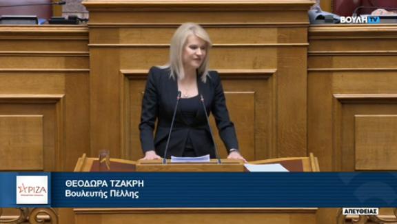 Η Γραμματέαςτης ΚΟ του ΣΥΡΙΖΑ-ΠΣ και βουλευτής Πέλλας κ. Θεοδώρα Τζάκρη, κατά την τοποθέτησή της στην Ολομέλεια του Κοινοβουλίου επί του σχεδίου νόμου του Υπουργείου Οικονομικών «Μέτρα για τον περιορισμό της φοροδιαφυγής», ανέφερε ότι πρόκειται για ένα νομοσχέδιο φοροεισπρακτικού τύπου, άδικο, οριζόντιο και αναχρονιστικόπου στοχοποιεί τους ελεύθερους επαγγελματίες και αυτοαπασχολούμενους, από τους οποίους προσδοκά να αυξήσει τα δημόσια έσοδα κατά 650 εκ. περίπου.