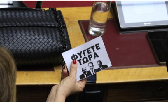 Τρικάκια πέταξαν από το θεωρείο της Βουλής ως διαμαρτυρία την ώρα που ο Κυριάκος Μητσοτάκης ανέβηκε στο βήμα.