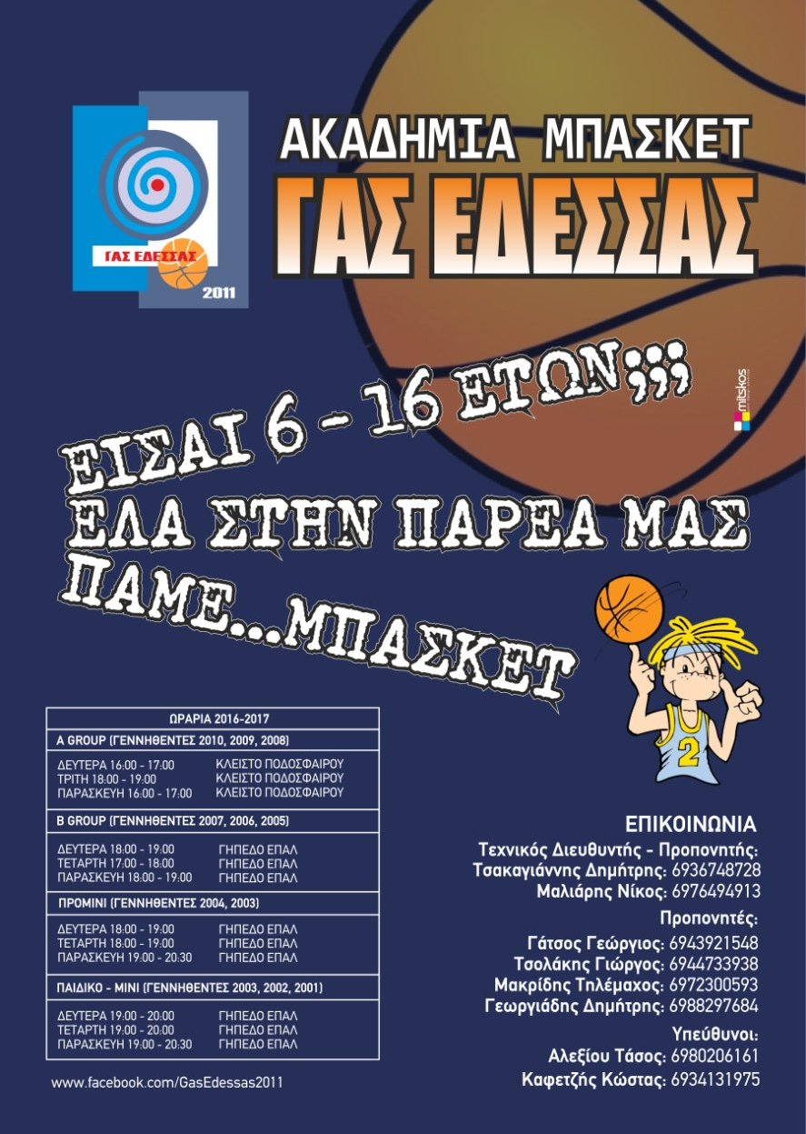 Με σύνθημα « Έλα στη παρέα μας πάμε … μπάσκετ», ο ΓΑΣ Έδεσσας καλεί αγόρια και κορίτσια 6-16 χρόνων, να έρθουν να μυηθούν στα μυστικά του μπάσκετ και να γίνουν μέλη της μεγάλης οικογένειας του ΓΑΣ Έδεσσας.