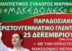 O Πολιτιστικός Σύλλογος Μαρίνας Ημαθίας "ΜΑΚΕΔΟΝΕΣ" σας προσκαλεί στο Παραδοσιακό Χριστουγεννιάτικο γλέντι στις 25 Δεκεμβρίου 2015 και ώρα 9 το βράδυ στο Κέντρο ΜΕΓΑΡΟ με πλήρες μενού και με απεριό