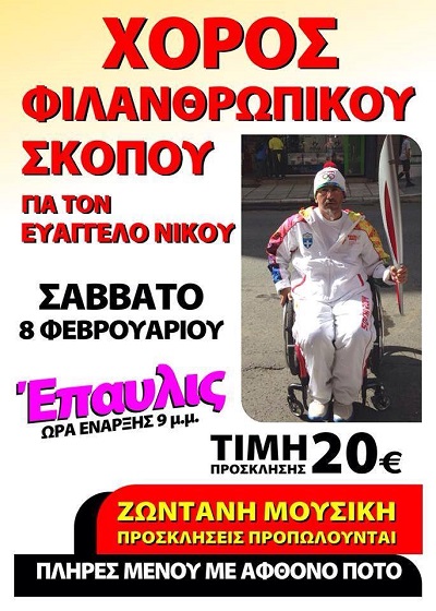 Το Σάββατο 8 Φεβρουαρίου στο κέντρο «Έπαυλις» έξω από την Έδεσσα θα γίνει χορός τα έσοδα του οποίου θα πάνε στον πρωταθλητή αγώνων Ευάγγελο Νίκου για τη συμμετοχή του σε νέους αγώνες.
